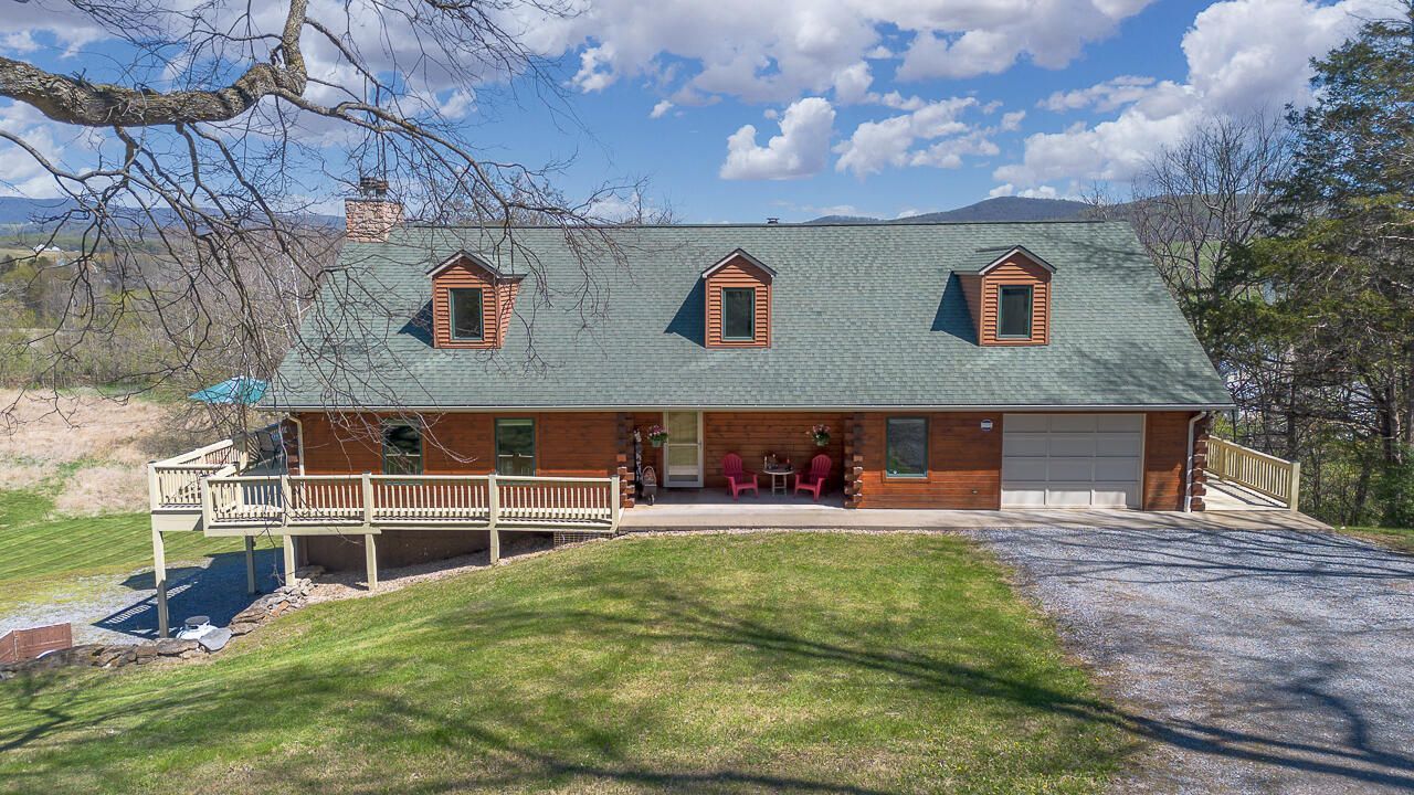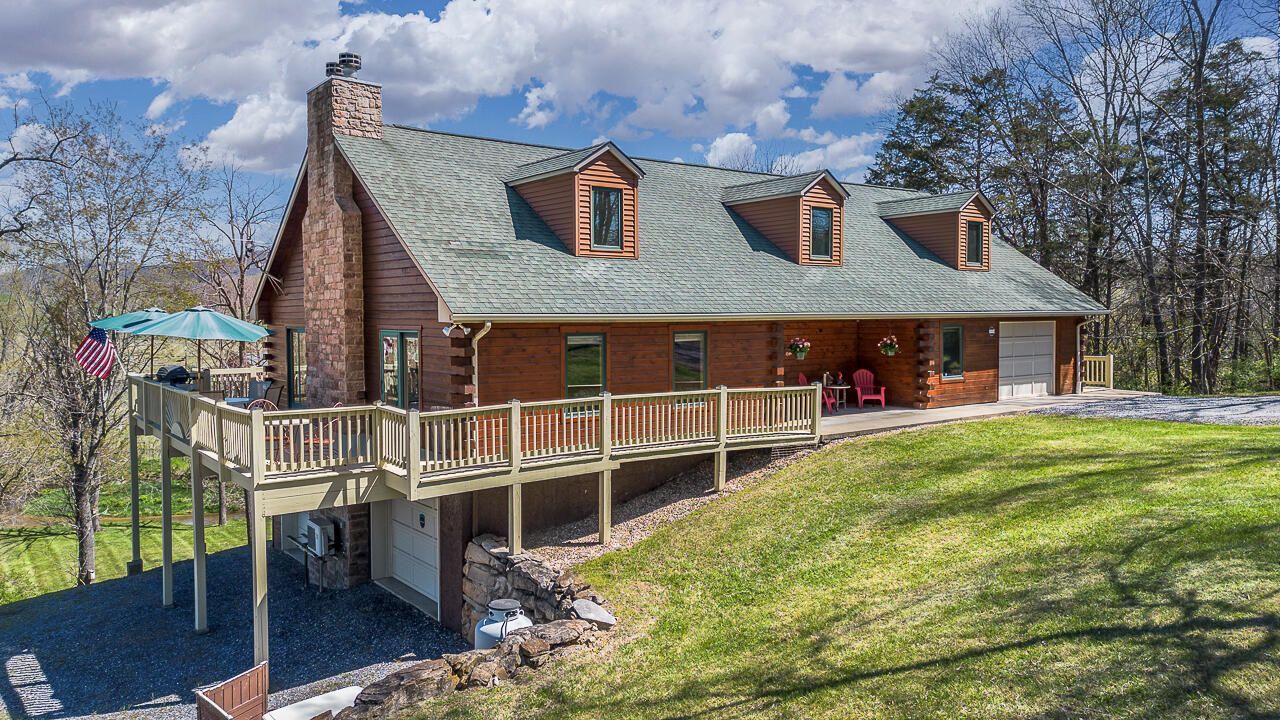 Nestled on 4 picturesque acres with Hays Creek gracefully bordering the property-complete with natural waterfalls-this beautiful log home offers serene living with spectacular views of Jump Mountain, the surrounding valley, and the rolling countryside. This well-appointed residence features three bedrooms, including a main-level suite, and three full bathrooms. A spacious great room boasts soaring cathedral ceilings and one of two stunning stone fireplaces, creating a warm and inviting atmosphere. A hobby/craft room and an office/study room are also in the home. Additional highlights include a whole-house generator, a covered front porch ideal for quiet mornings, full walk-out basement, and a large side deck perfect for entertaining while enjoying the scenic backdrop.